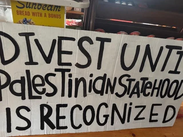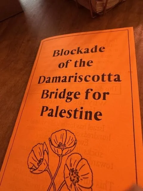 During the Pumpkin Festival, a major public event and tourist attraction in Damariscotta, Maine, Palestinian solidarity activists staged a blockade of the bridge into town. The main organizer was arrested within minutes but other activists lined the bridge, holding up banners and signs for Palestine. Their leaflet read, in part,