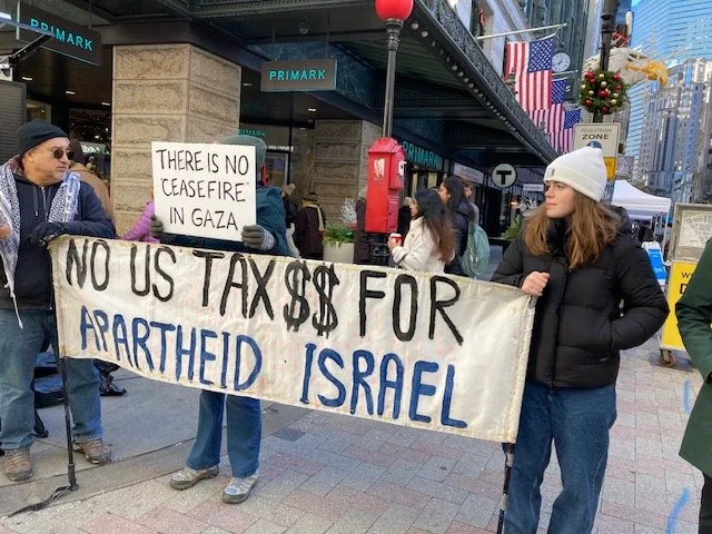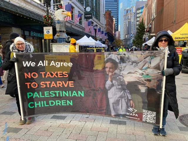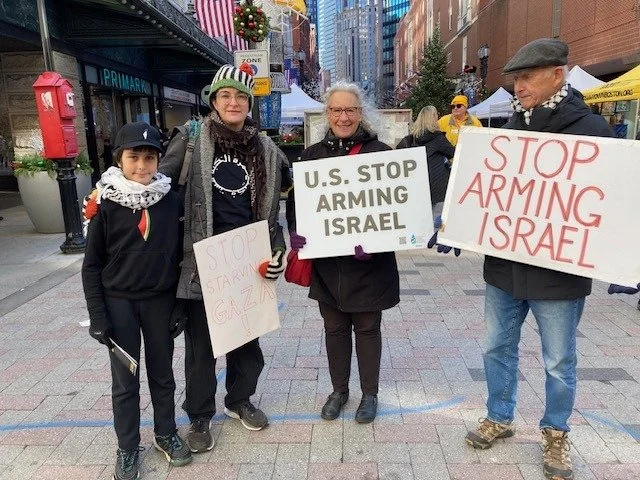"Don't be fooled - there is no 'ceasefire' in the Gaza Strip!" This is the message that the Alliance and Mass Peace Action conveyed to the public during their stand out in Boston's Downtown Crossing on Nov. 29, the International Day of Solidarity with the Palestinian People. They gave out 400 flyers letting the public know that some 350 Palestinians have been killed by Israeli bombardments since the US-engineered 'ceasefire' began on Oct. 10. And still only a third of the amount of food and water stipulated by the 'ceasefire' agreement is permitted by Israel to enter the Gaza Strip. The genocide is ongoing, made possible by our tax dollars and weapons. In 2024 alone the US gave Israel $22 billion to destroy Gaza - we must push for a total arms embargo on Israel!