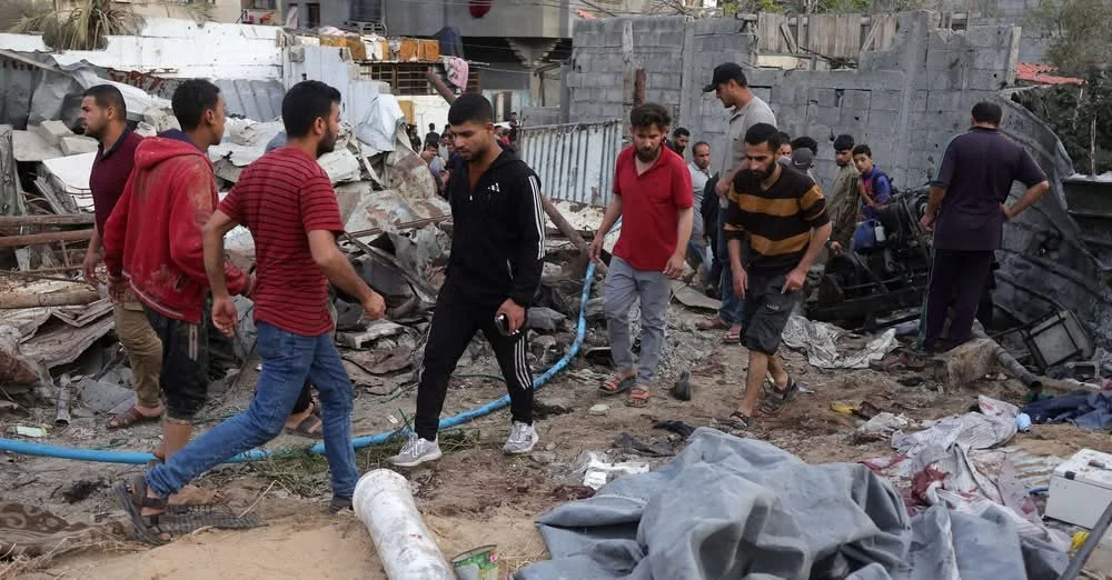 Palestinians check the site of an Israeli strike on a water well in al-Saftawi area west of Jabalia in the northern Gaza Strip, on May 18, 2025.