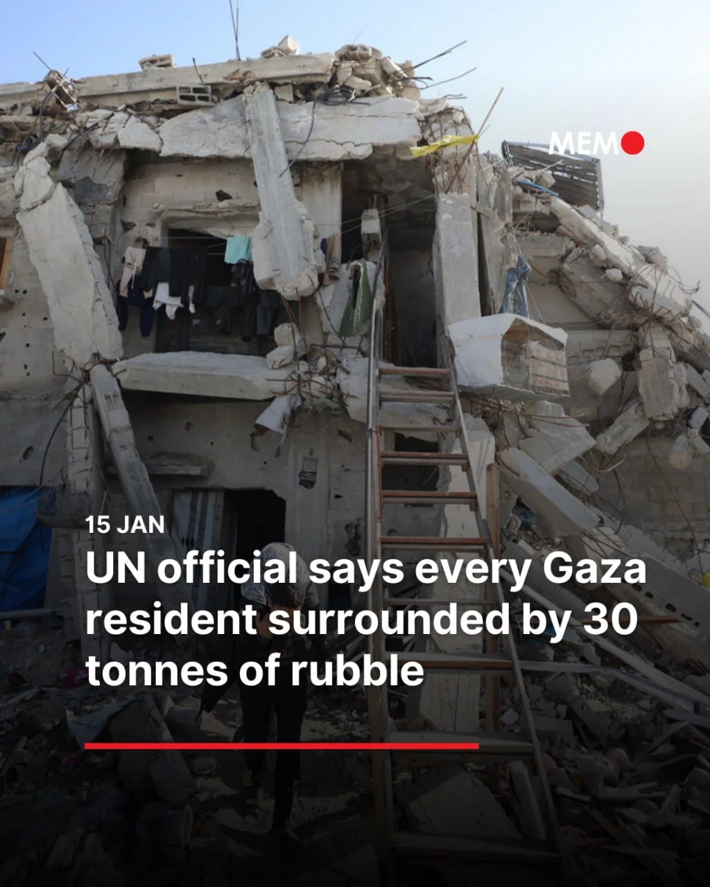 A senior UN official has said that each person in Gaza is now surrounded, on average, by 30 tonnes of rubble, highlighting the scale of destruction in the territory.