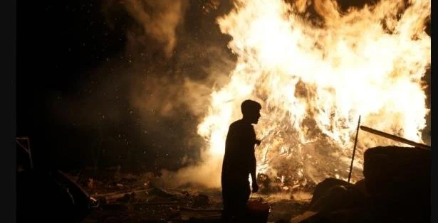 An activist helps extinguish a fire set during a settler acct in Al-Tuban, Masafer Yatta, occupied West Bank, January 27, 2026. | Photo: Roni Amir / +972 Magazine