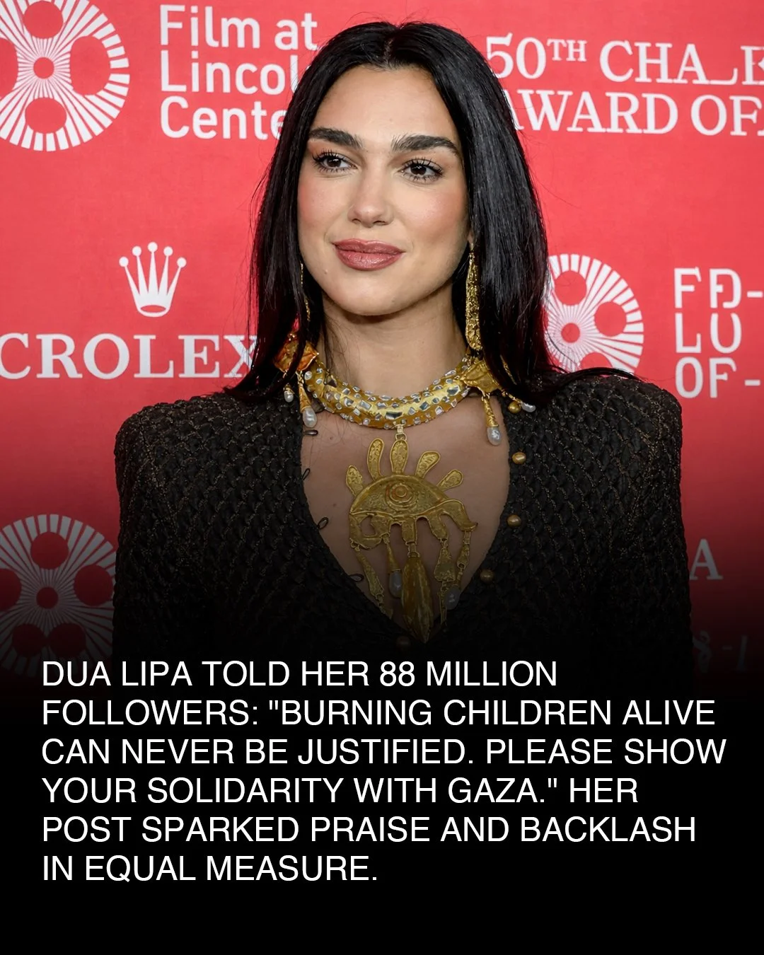 In May 2024, after an Israeli airstrike on a displacement camp in Rafah killed at least 45 Palestinians, Dua Lipa posted on Instagram: "Burning children alive can never be justified. The whole world is mobilising to stop the Israeli genocide. Please show your solidarity with Gaza."