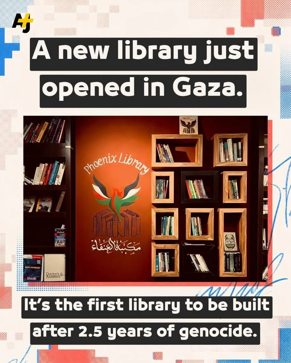 A New Library in Gaza April 24, 2026 Pam Rogers via AJ+These Palestinians opened a new library in Gaza, the Phoenix Library. They collected hundreds of books, including some pulled from the rubble of Israel’s destruction.